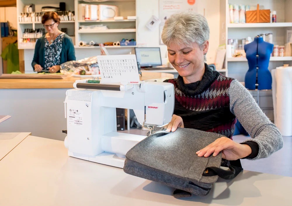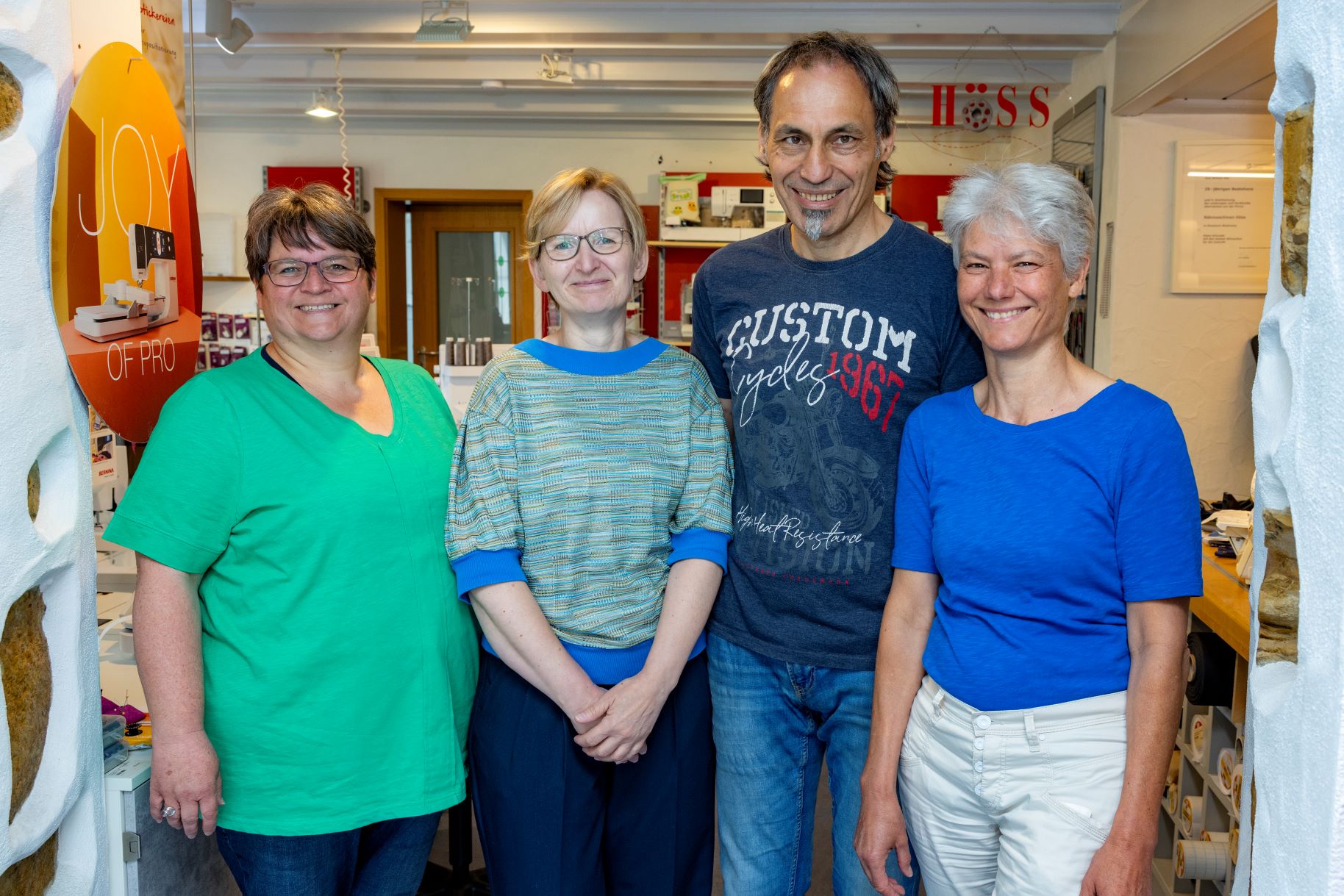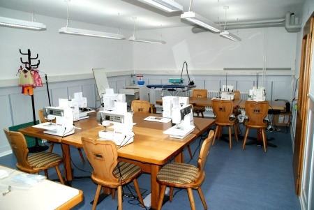 Das ist unser Geschäft in Wahlwies. Wir haben Verkaufsräume für Nähmaschinen und Zubehör sowie separate Räume für unsere regelmäßigen Nähkurse. Außerdem befindet sich im selben Gebäude unsere hauseigene Werkstatt.